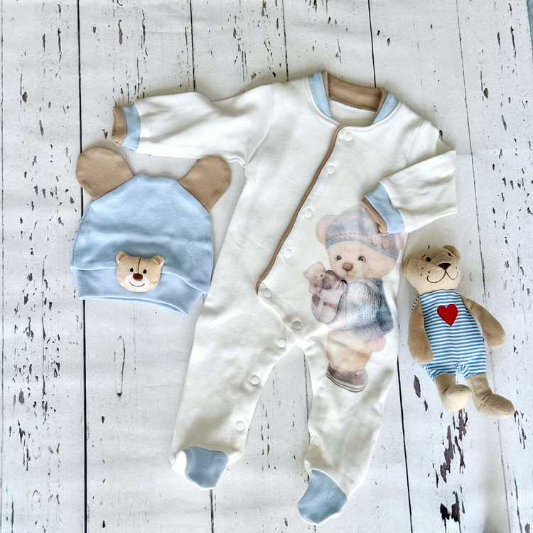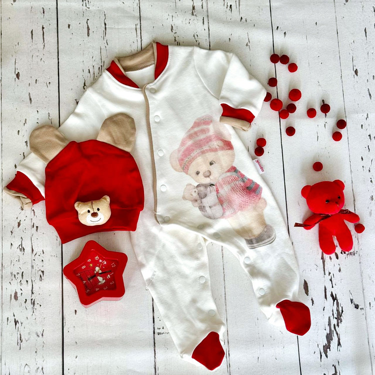 - کلاه از جنس نخ پنبه است و روی آن سر عروسک خرس تدی دوخته شده است